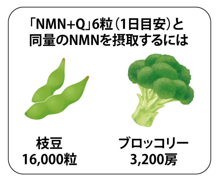 NMNは、私たちの体内だけではなく、ブロッコリーや枝豆などの食品にも含まれている物質なのですが、ごく微量しか含まれていないため、効果を体感できるほどのNMNを食品から摂取するのは難しいという現実がありました。